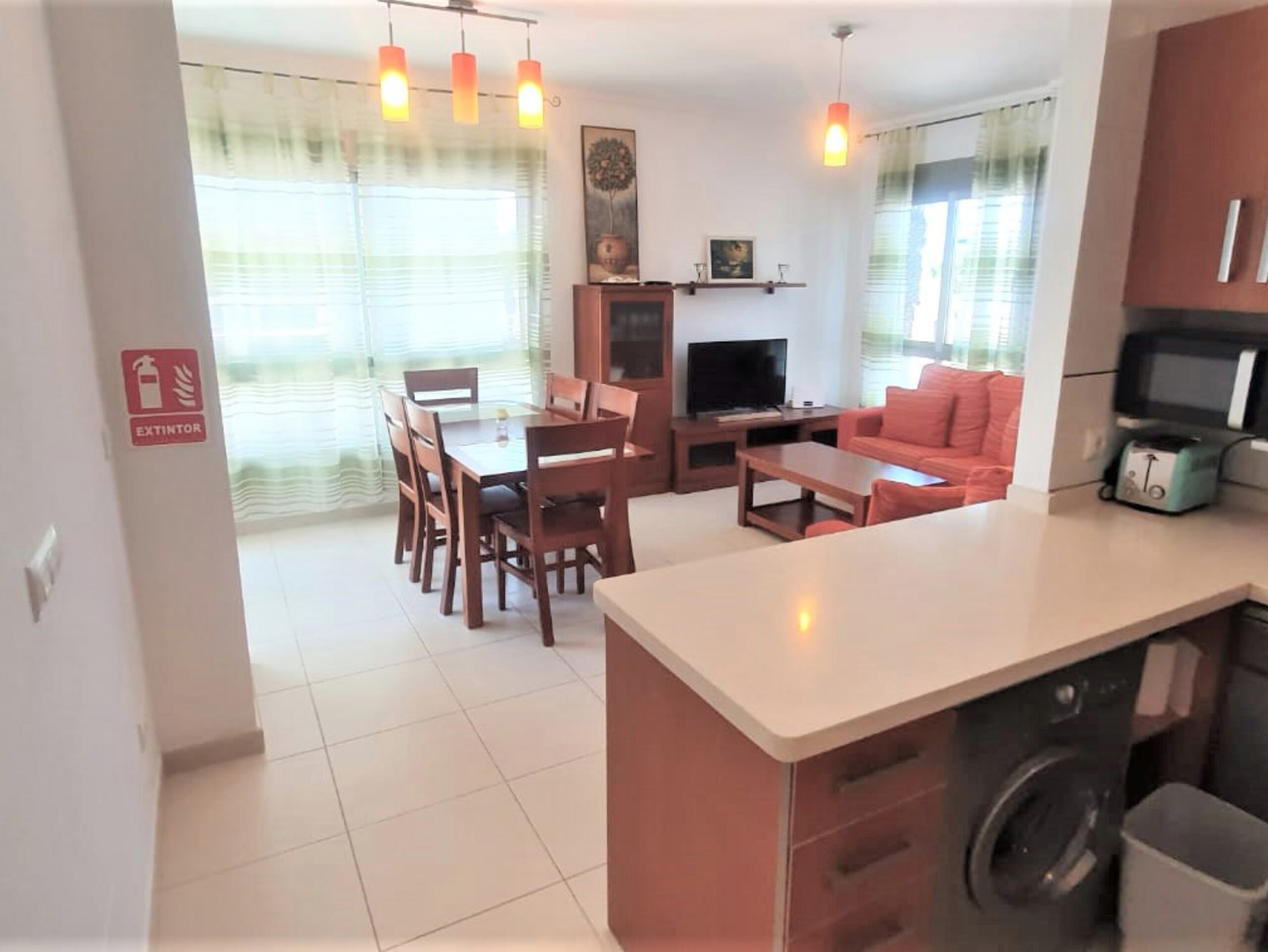La vivienda cuenta con cocina actual y moderna, vitro, horno, extractor de humo, lava-vajilla, frigorífico, microonda, lavadora, tostadora, aire acondicionado, bomba de calor, TV.