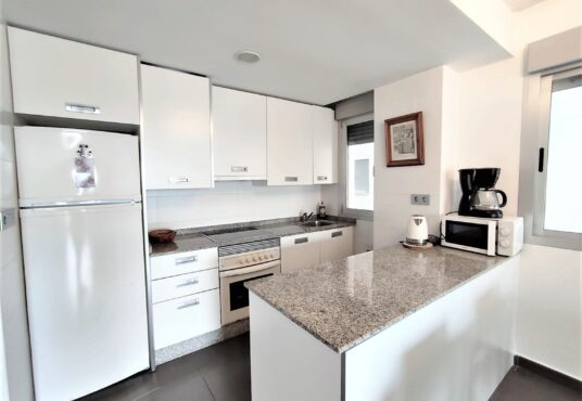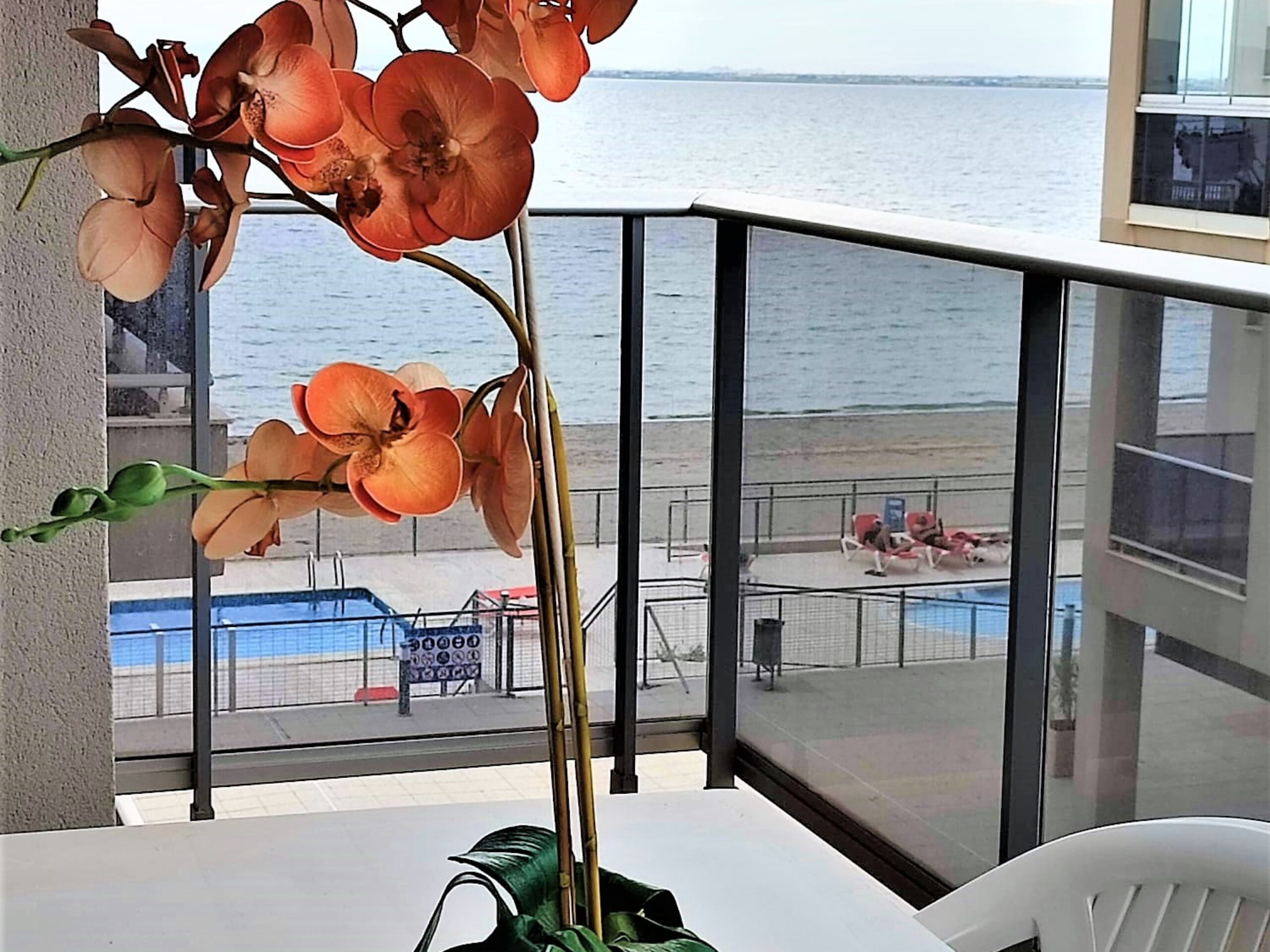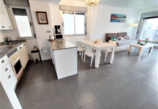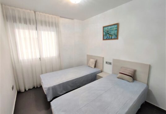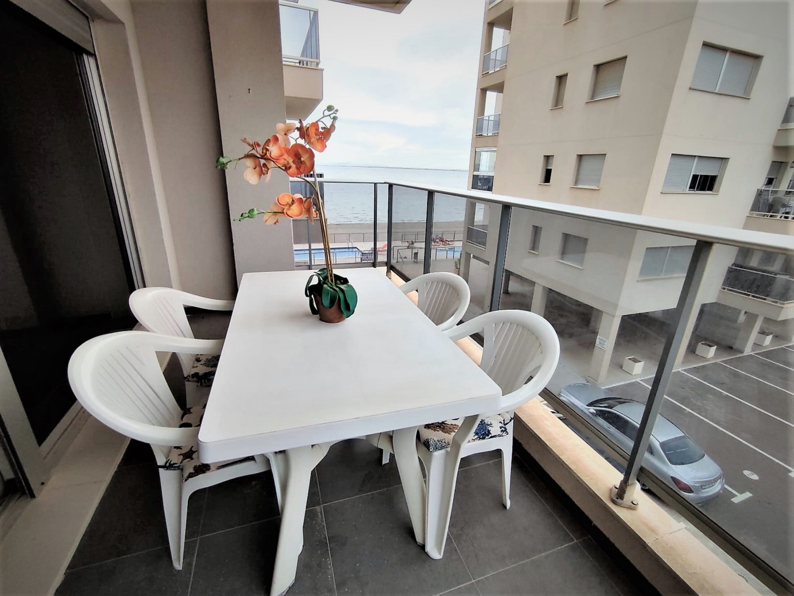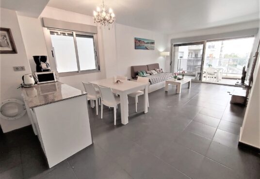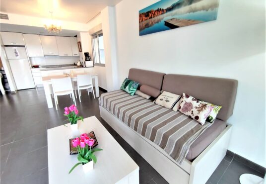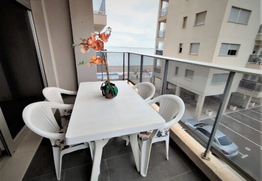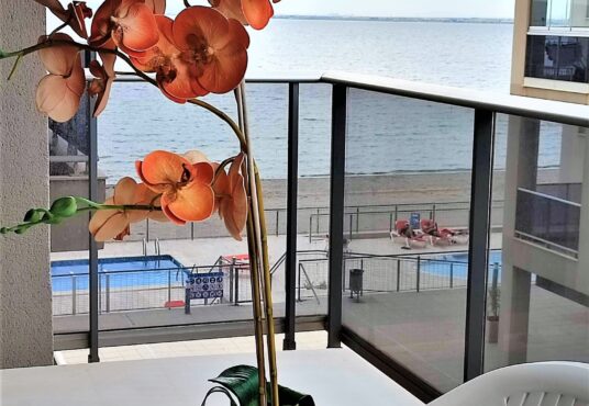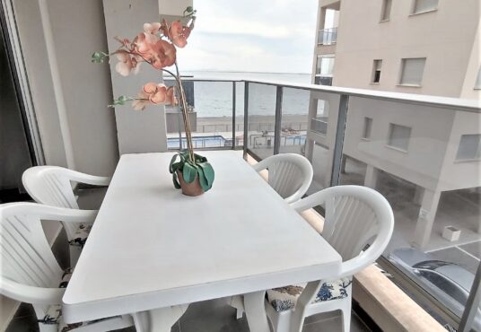 Bonito y cómodo apartamento en la orilla del Mar Menor. Tiene 2 dormitorios 2, baños, parking, piscinas de adultos y niños. Se encuentra en el km 17 de Gran Via de La Manga